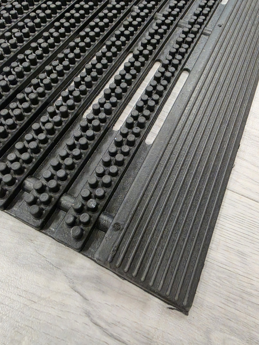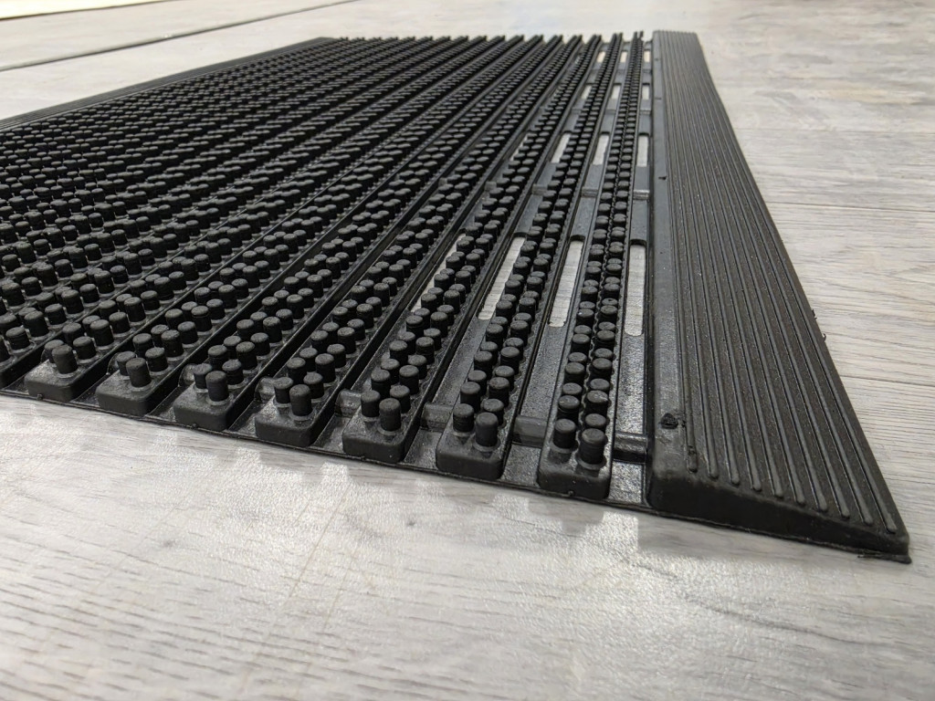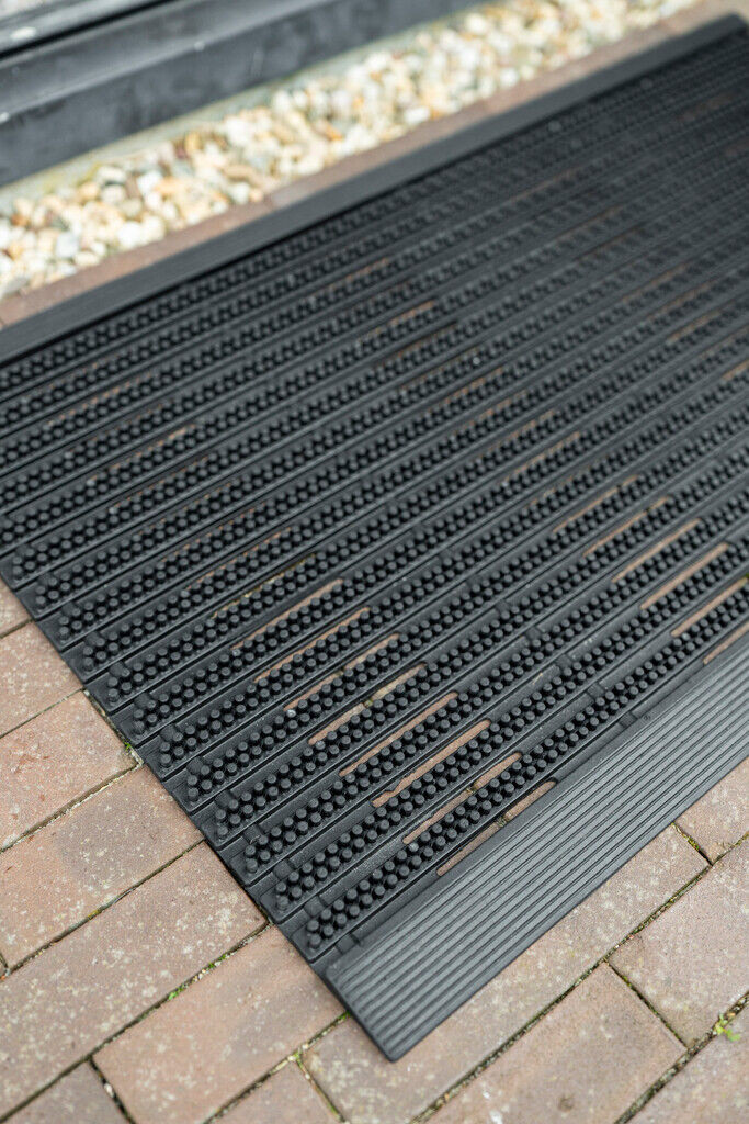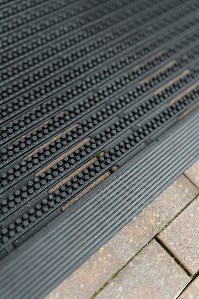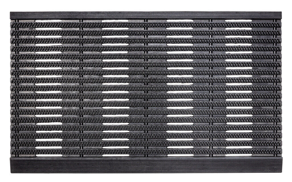 Masszív gumiból készült kültéri lábtörlő erős kaparó hatással, amely hatékonyan eltávolítja a sarat, homokot és egyéb durva szennyeződéseket. Időjárásálló, nagy teherbírású kivitelben, hosszú élettartamra tervezve. Nehéz, strapabíró kültéri gumi lábtörlő csíkos, bordás mintázattal és kis méretű gumi tüskékkel.
