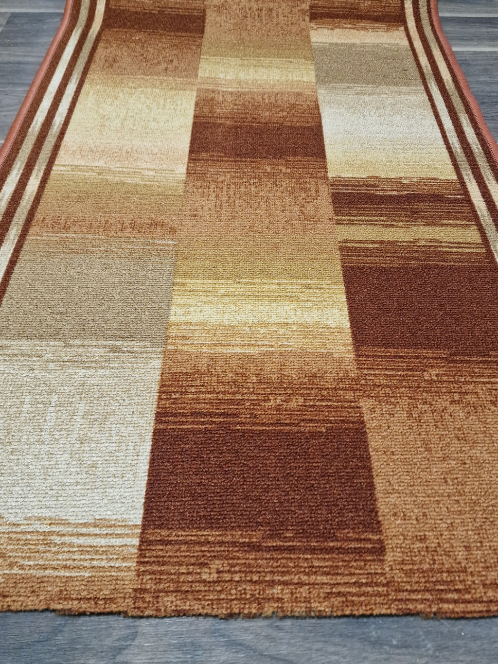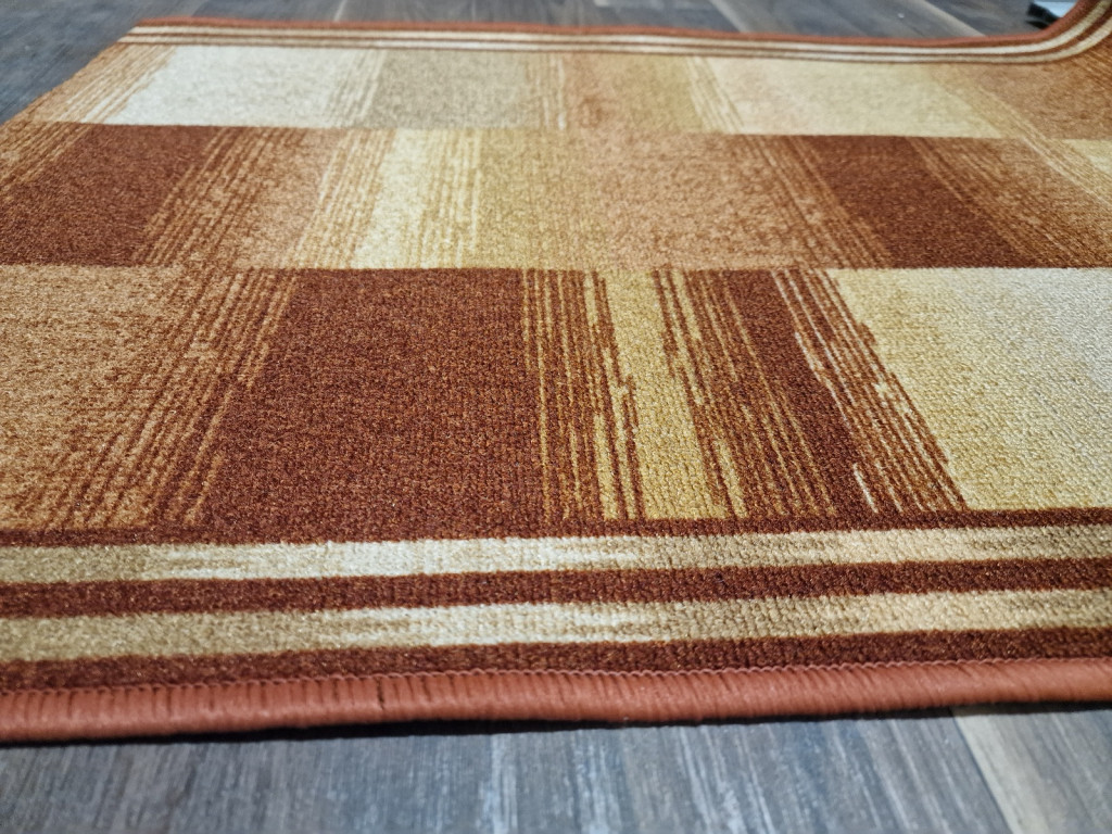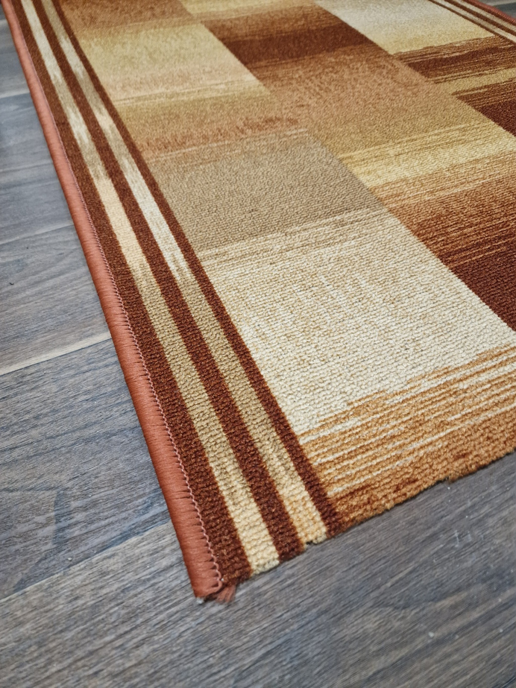Hurkolt, színes, mintás futószőnyeg, gumis hátoldallal. Nagyon szépen kidolgozott, I. osztályú termék. Strapabíró, erős, könnyen tisztán tarható. Közepes/intenzív lakossági igénybevételt is elvisel. Tartós, időtálló anyag. Padlófűtésre és lépcsőre is rakható. Jól viseli a nedvességet is. Csúszásmentes a járó felülete és UV álló az anyaga.