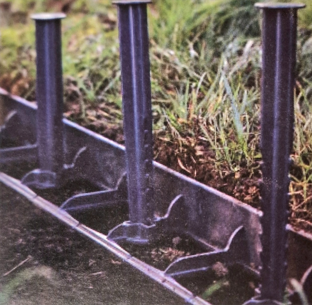 - A leszúrható tüskék biztos rögzítést nyújtanak: egyenes szakaszokon 2-3 db, íves vagy kör szegély esetén 3-6 db leszúró szükséges méterenként.